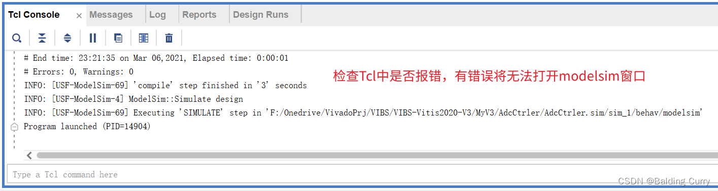 如果仿真一直卡在上图所示界面而不打开modelsim窗口,可能是仿真出错了,注意检查Tcl Console窗口看是否有error。