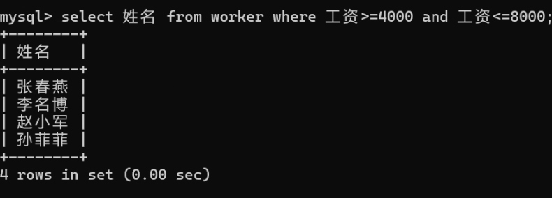 select name from t_worker where 工资>= 4000 and 工资<=8000;