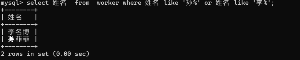 select 姓名 from worker where 姓名 like '孙%' or 姓名 like '李%';