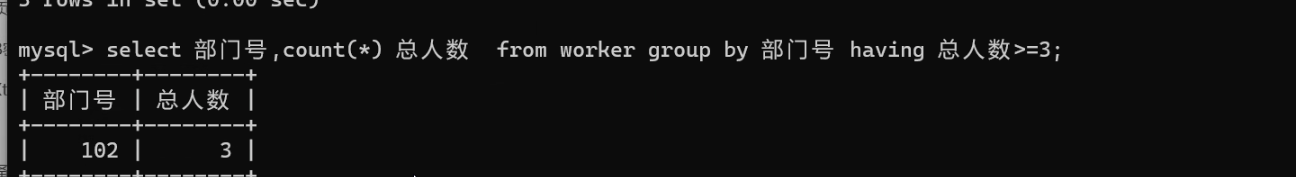 select 部门号, count(*) 总人数 from worker group by 部门号 having 总人数>=3;