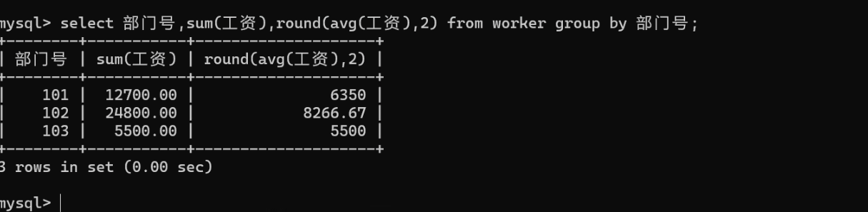 select 部门号,sum(工资),round(avg9工资),2) from worker group by 部门号;