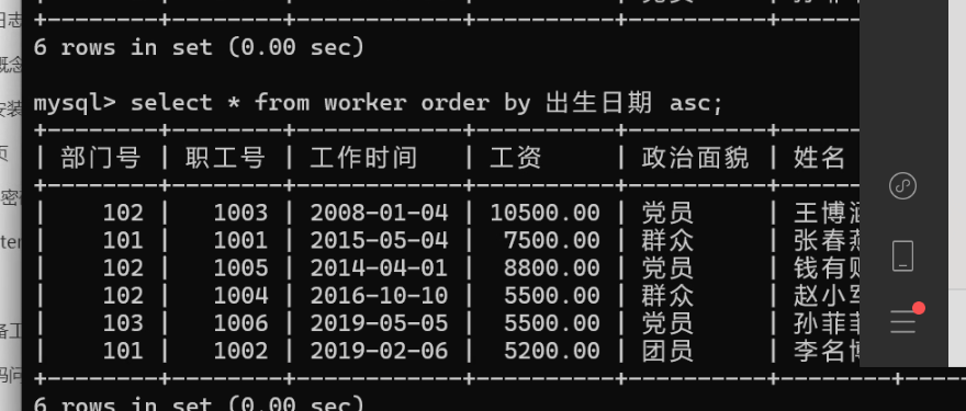 select * from t_worker order by 出生日期 asc;
