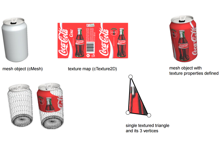 (c) 将纹理贴图投影到 3D 网格对象上。每个顶点在空间中都有一个位置(x,y,z)以及一个2D纹理坐标(s,t)。