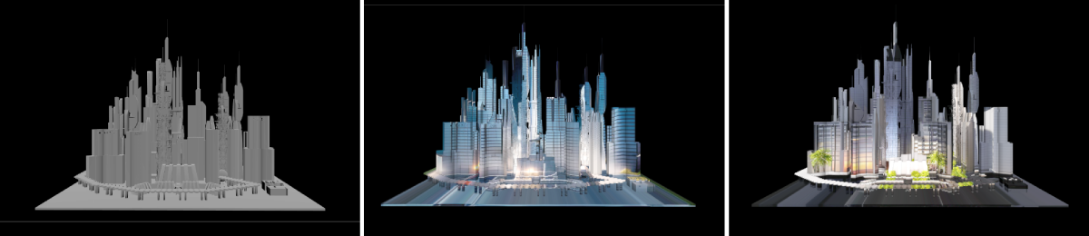 图一为原始模型, 图二图三为贴图后的模型。提示词:city, Realistic , cinematic , Front view ,Game scene graph