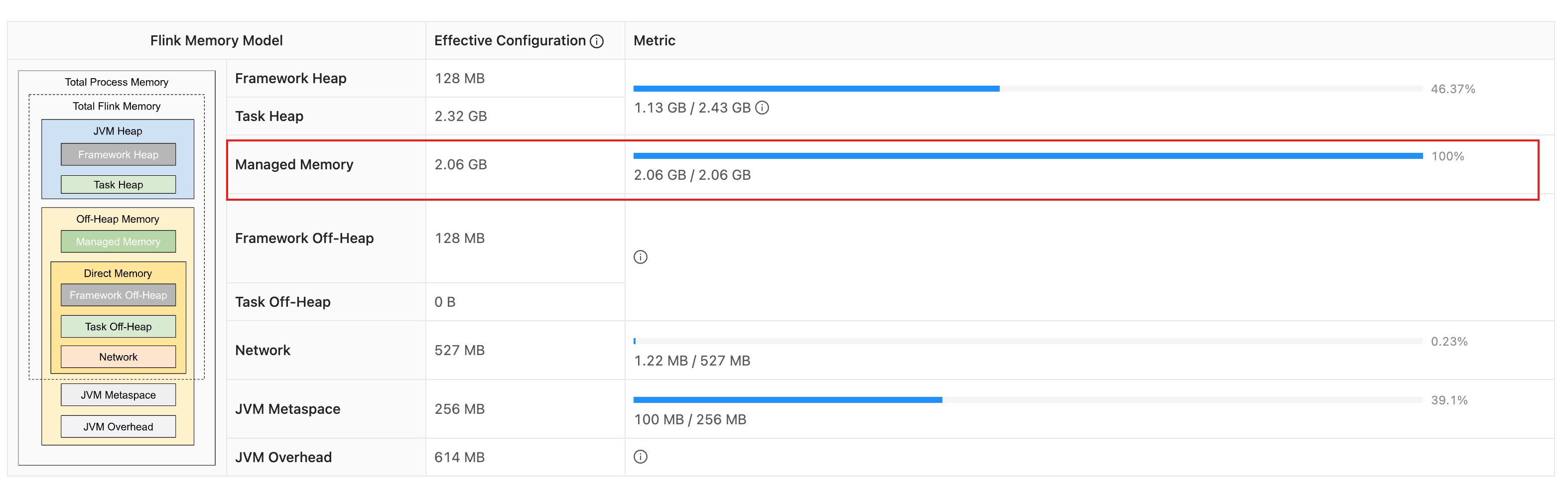 上图中的状态首先写入堆外内存,即下图中的managed memory,默认占taskmerery的0.4,根据rocksdb状态可以调整对应的大小,生产中有个冲mongodb采集数据到kafka的任务没什么状态,就可以把这个调小,