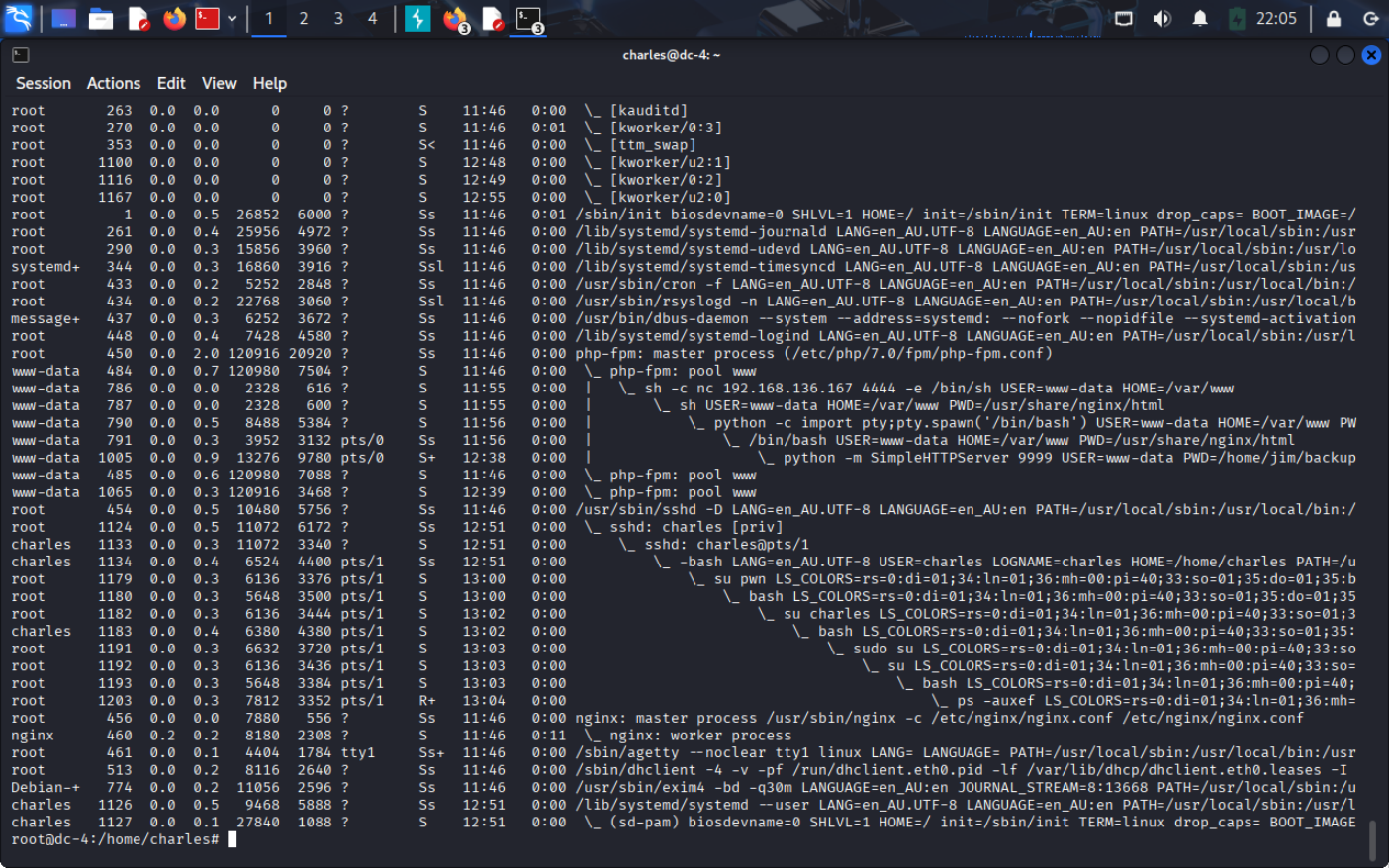 输入ps -auxef,发现了www-data用户的nc连结和charles用户的切换用户时产生的颜色变化。值得注意的是修改passwd和sudoers的操作并没有被记录下来,并且邮箱告警也只会在密码次数错误太多才会发出。