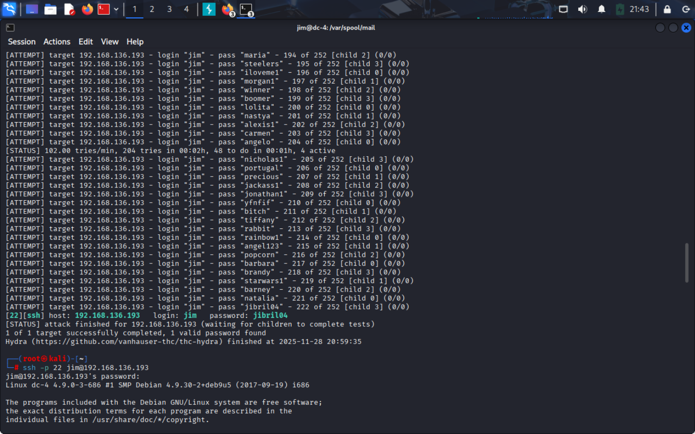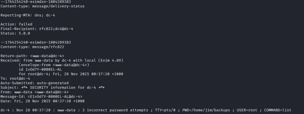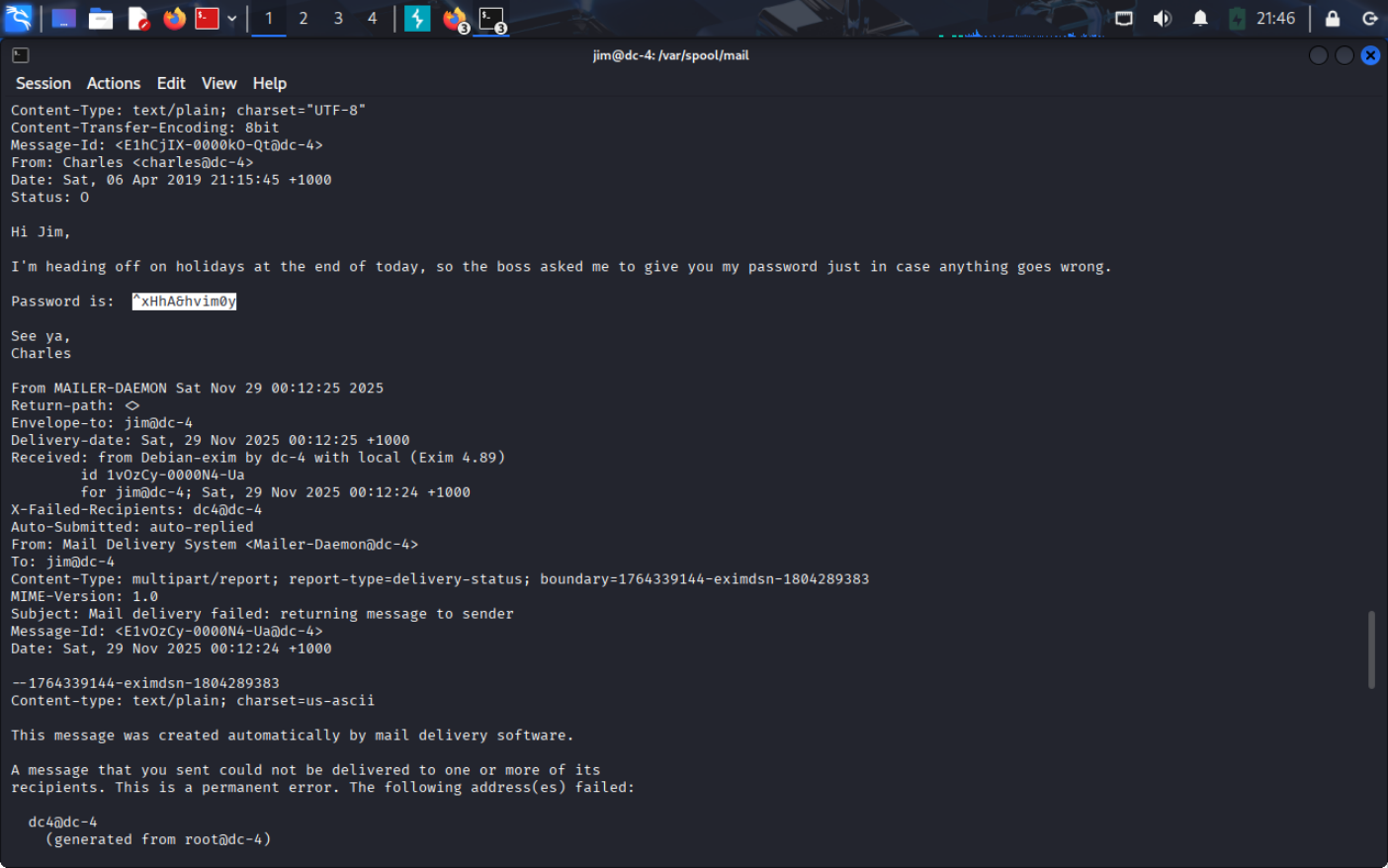 登录后使用sudo -l发现jim用户没有任何特殊权限,但是在它的邮箱发现了另外一个用户的密码。