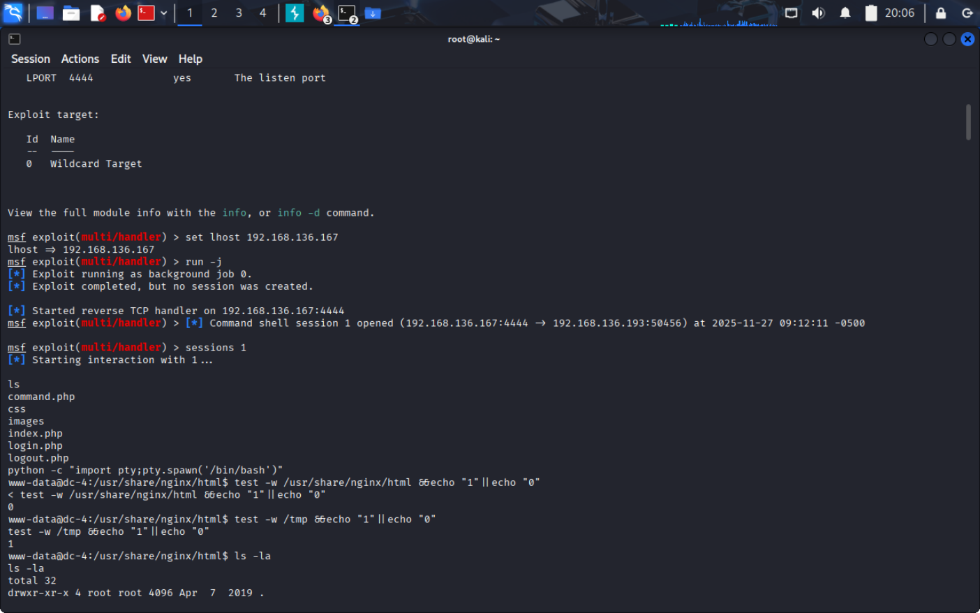 用msf监听模块开启监听,发送nc命令后,建立反弹shell,发现目录缺失不能写,只能写到tmp目录写,如果过分操作还会被记录,自动发送邮件。