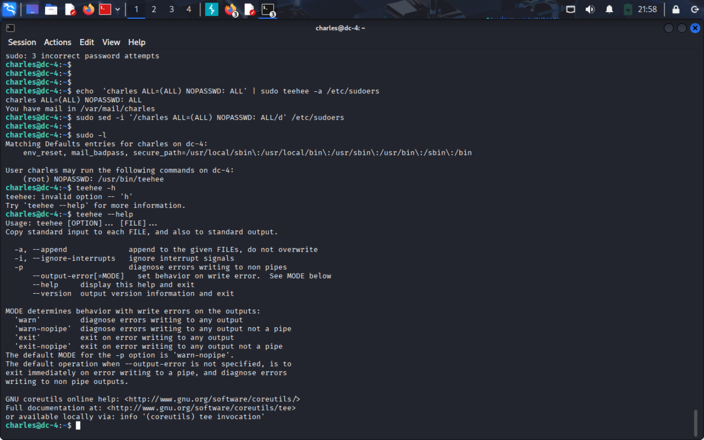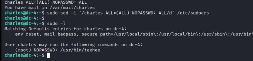 切换到charles用户,输入密码,检查sudo -l 发现有sudo tee的nopass 的特殊权限