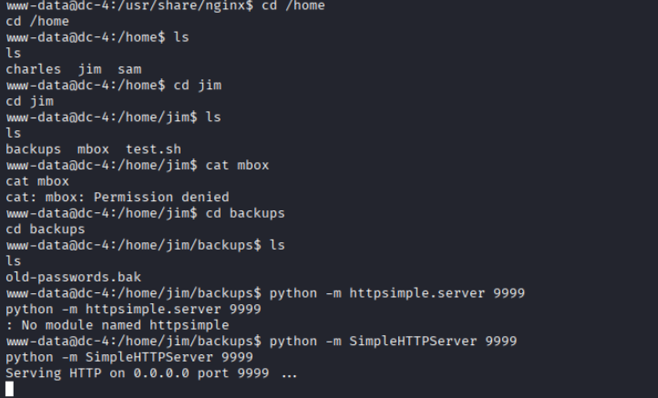 使用find 查找suid也没发现重要的文件,test.sh也没有什么用处。搜集一番后发现系统有个三个用户,同时还有jim的备用密码,还有一些邮件信息。使用python开启hfs服务下载密码备份表进行爆破。