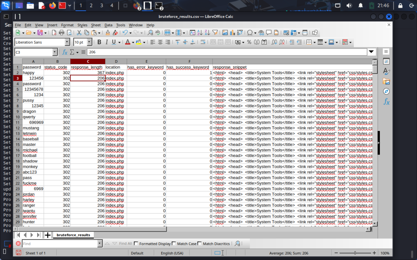 由于很难说清楚登录成功后的状态是302还是303或者是200,我的脚本就把常见的字段保存为csv,然后分析知道,happy是正确答案。值得注意的是,如果你爆破时候带了cookies,那么happy之后的字典都会成功,因为这个时候服务器已经标识你成功登录了,不会验证了。