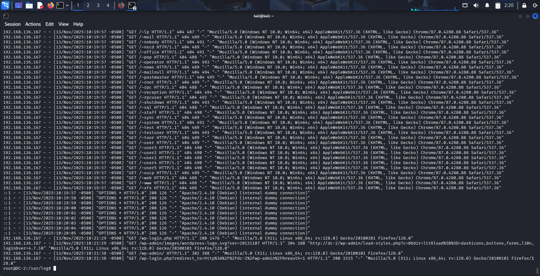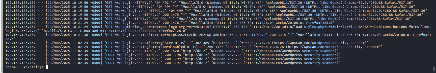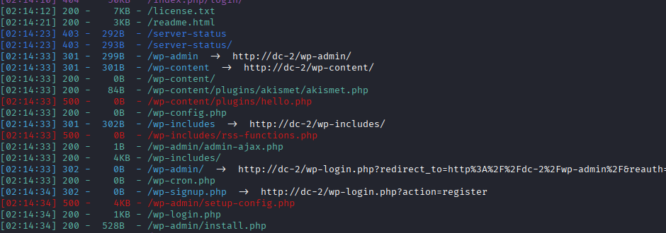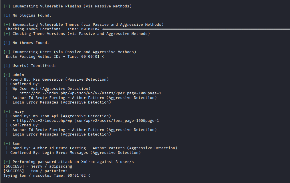 wpscan --url http://dc-2 -e vp,vt,u -P /usr/share/wordlists/dc2.txt -t 20