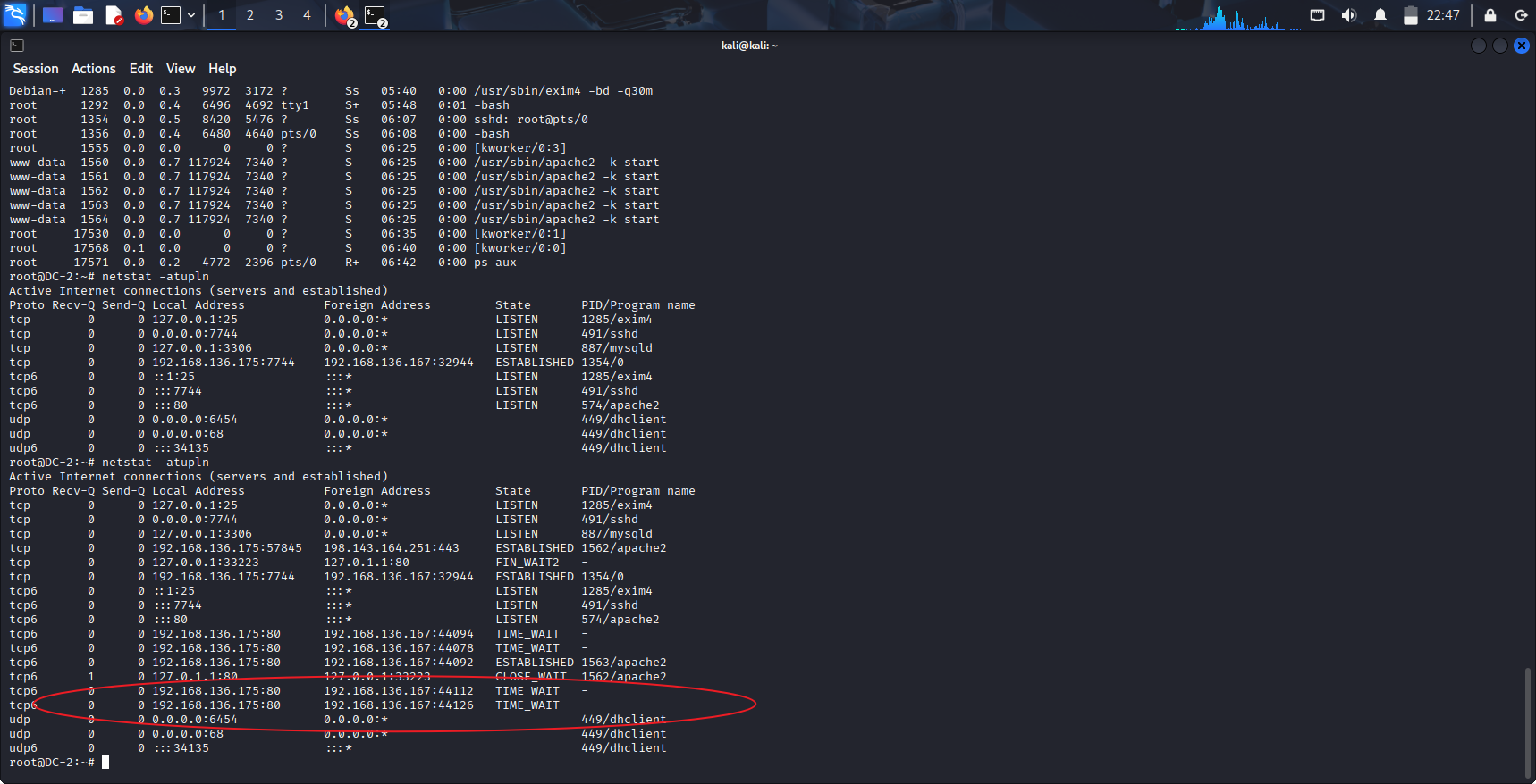 输入netstat -tunpl 和 ps aux监视网络和进程变化。
