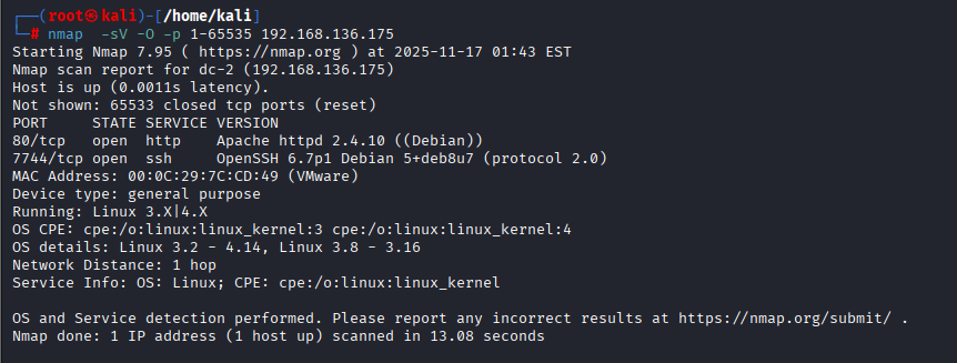 尝试访问80端口,发现会跳转到http://dc-2,这表明网站要求采用域名方式访问,但dc-2这个域名本地无法解析为ip地址,因此需要在hosts文件中添加DNS解析条目: