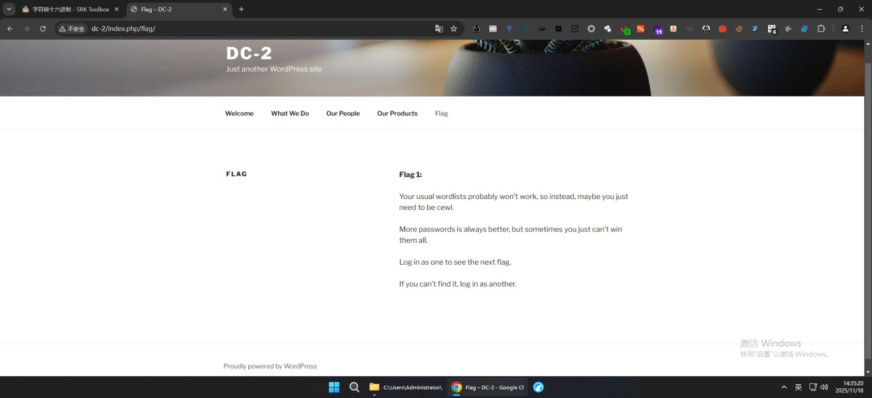 配置好后,根据页面提醒,这是一个 WordPress site。同时发现了flag1,它提示我们需要用cewl工具来生成字典。