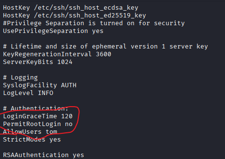 在完成通关后,我们获得了一个root账号权限,通过修改sshd文件,新增root用户密码,配置sshd服务允许管理员root账户登录,并将root账户加入可允许登录账号得列表中(此前只有tom可以登录)。