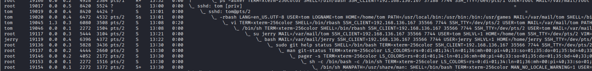 用户tom登录后,等到rbash的shell,通过vi提权后得到/bin/sh,重新设置path后,切换jerry,又通过git提权到了root。