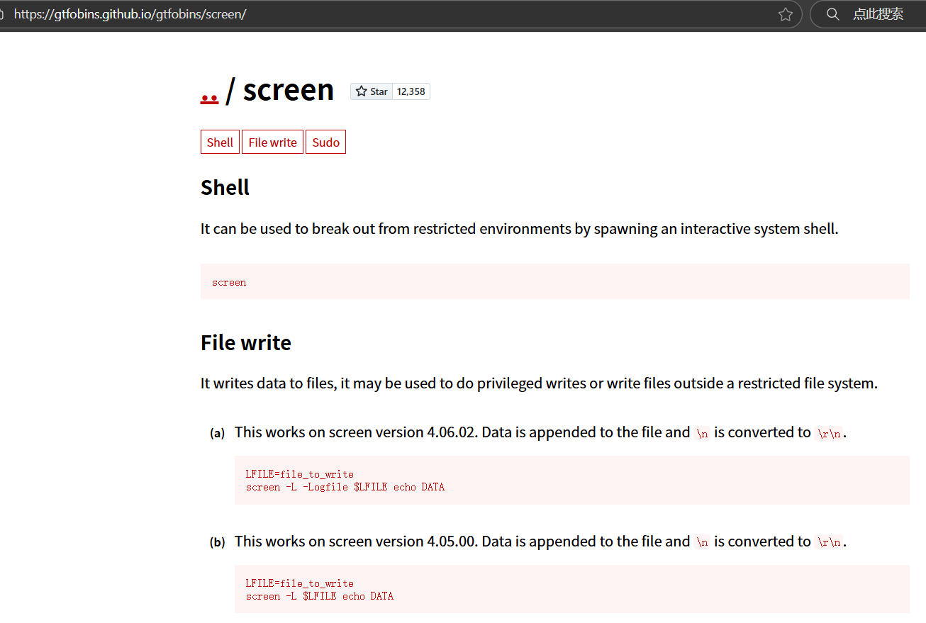 发现有个screen程序,他是远程运维的一个程序,查看版本是screen 4.5,再gtfobins网站查询,发现具备任意写文件的问题。