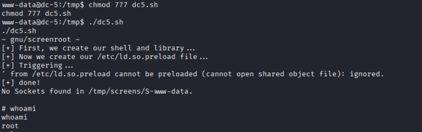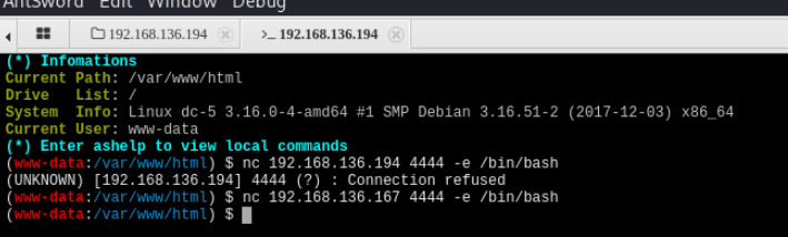 我们通过之前的antsword建立的session上传文件,并在反弹shell中执行这个脚本(记得给它执行权限 chmod 777 dc5.sh)