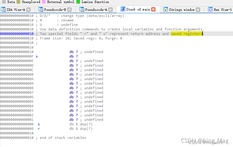 在main函数中,双击s,s占据了15个db,再加上"s"[saved registers]的8个db,一共23个db.