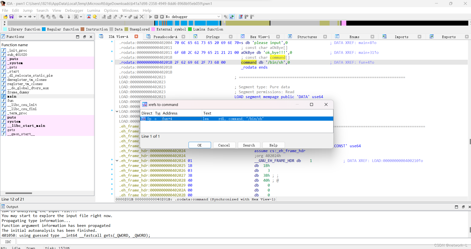 - 发现bin/sh,双击bin/sh,点击command,点击X,发现地址再fun函数里