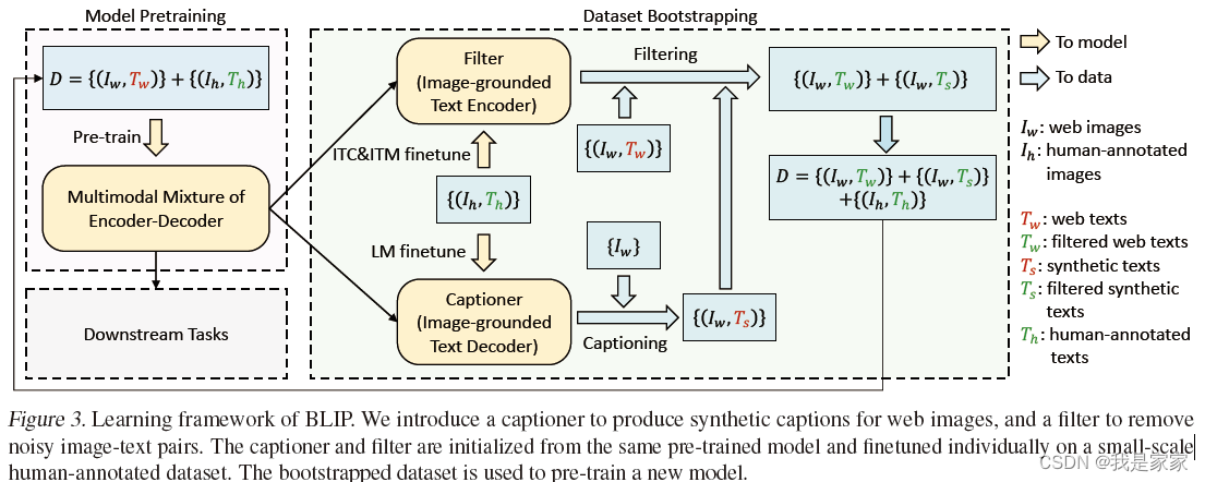 BLIP通过引导字幕有效地利用有噪声的网络数据,其中字幕生成器生成合成字幕,过滤器去除有噪声的字幕。