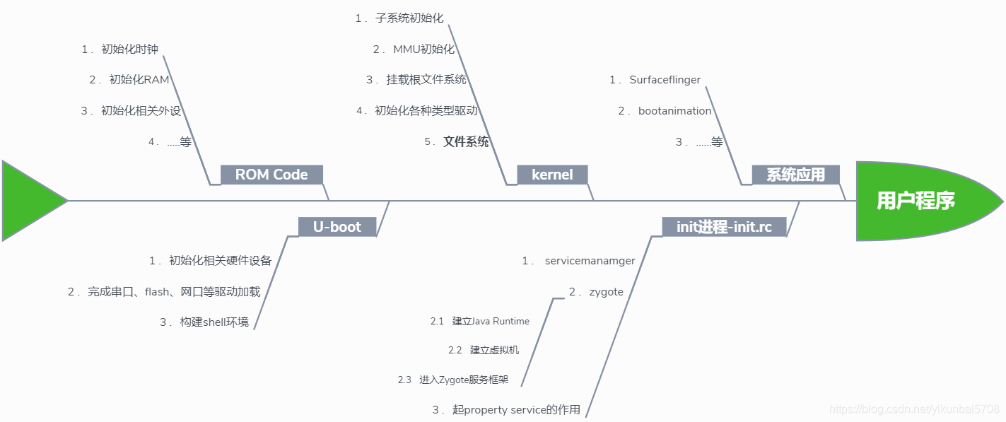 前段时间参与一个kernel层的应用开发,所以简单的总结了从linux启动到android应用加载。如下图所示,主要将启动流程分为了6个步骤,其实里面还有很多细分的步骤,但是我主要总结的是linux层的流程。5个步骤为: