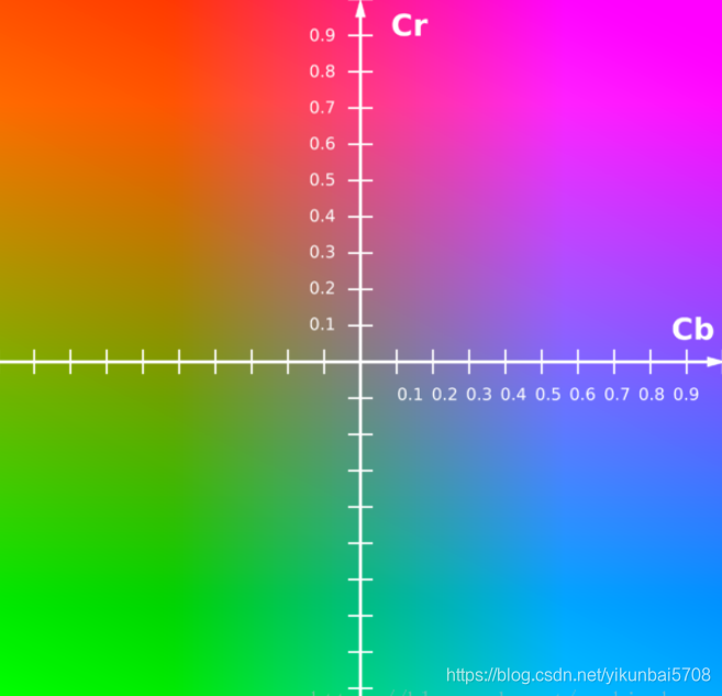 Y表示亮度,CbCr与UV分量对应,表示颜色。怎么表示颜色,可以看下面这幅坐标图: