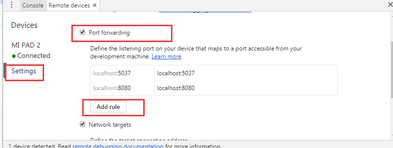 如果是用上面一种方法打开远程设备界面的方式,在Settings里面的Port forwarding中,点击Add rule添加端口。