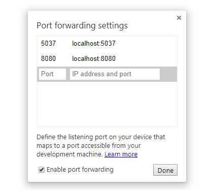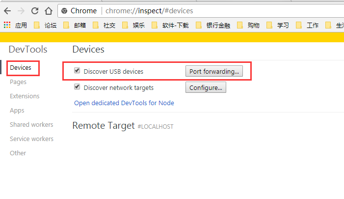 如果是用第二种方式(直接在地址栏输入地址)打开远程设备界面的,启用Discover USB devices,点击“Port forwarding...”按钮打开窗口添加端口,如下图所示: