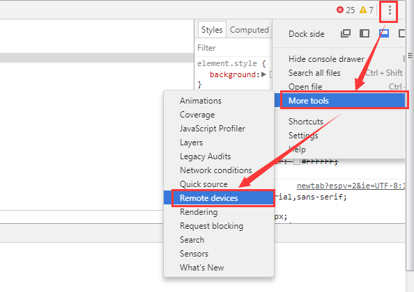 PC中打开Chrome浏览器,在“菜单->更多工具->开发者工具”,或使用快捷键“Ctrl+Shift+I/F12"打开开发者界面,在调试面板中,点击右侧菜单按钮,在下拉菜单中“More tools->Remote devices”,打开远程设备界面,如下图所示: