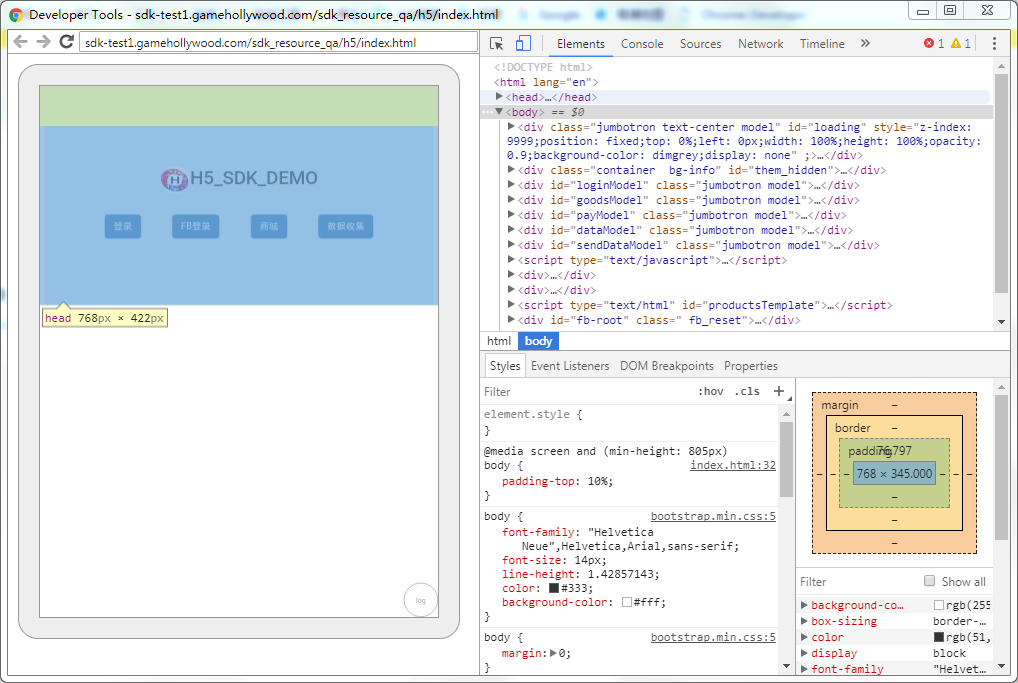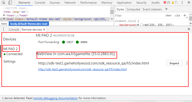 连接接上远程设备,可以看到设备信息和调试加载的页面,如下图所示: