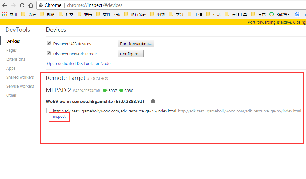 在远程设备界面中点击“inspect”进行跟踪调试,打开跟中调试界面,如下图所示: