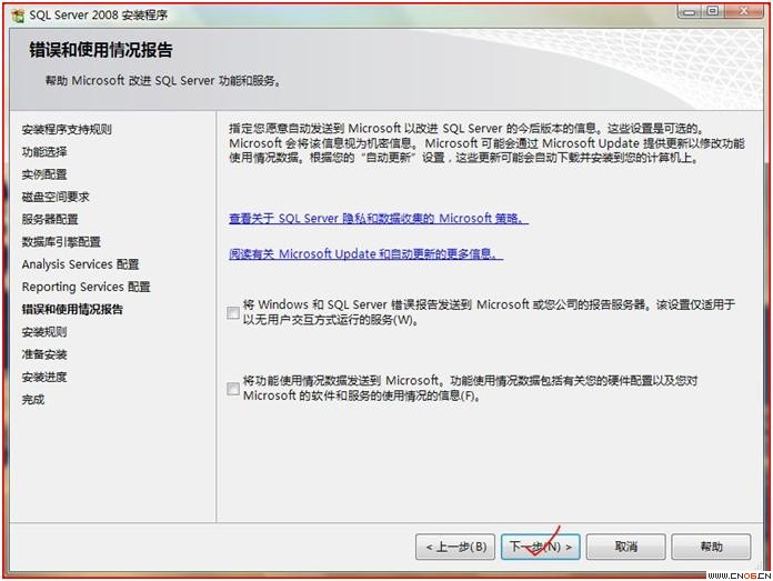 错误和使用情况报告,这里我们不选择向微软发送错误报告,直接”下一步”;
