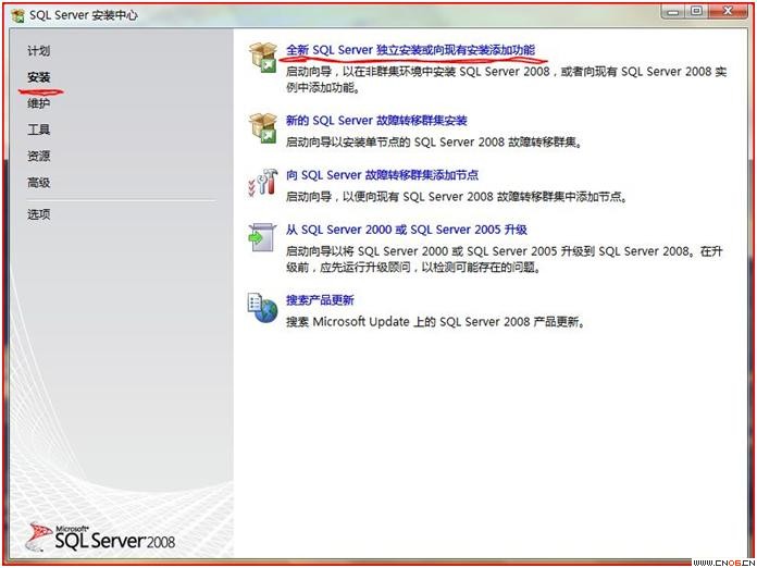上图为安装主界面,包含了有关 SQL Server 2008 的各种信息,很直观,开始安装选择:全新 SQL Server 独立安装或向现有安装添加功能;