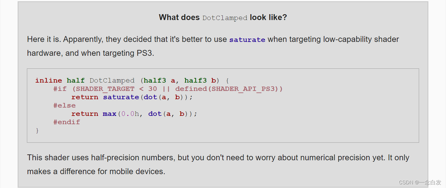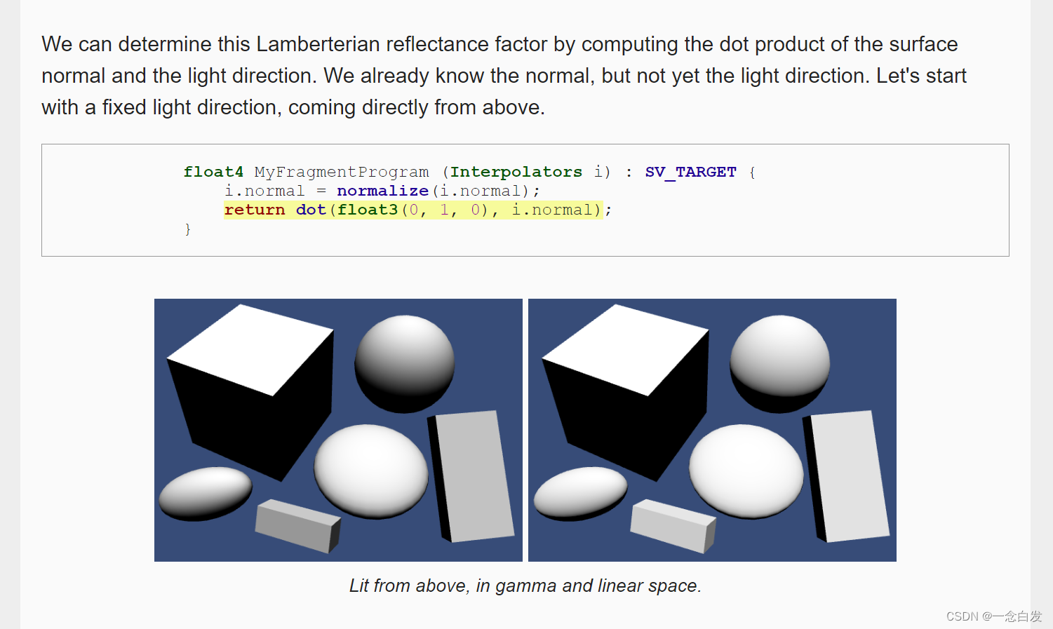 这里看一下两个空间下的对比,其实法线等信息,俩空间下都是一样的,根据不同空间有不同的值,在shader中不同的是他们都把光源写成了010,但是这并不公平,因为线性空间用这个算出的结果,换成gamma空间时,会多加一个0.45次方。对于法线,gamma空间已经加了,对于光照这个,并没有加,而如果变换过去应该加的。所以gamma就暗一些。