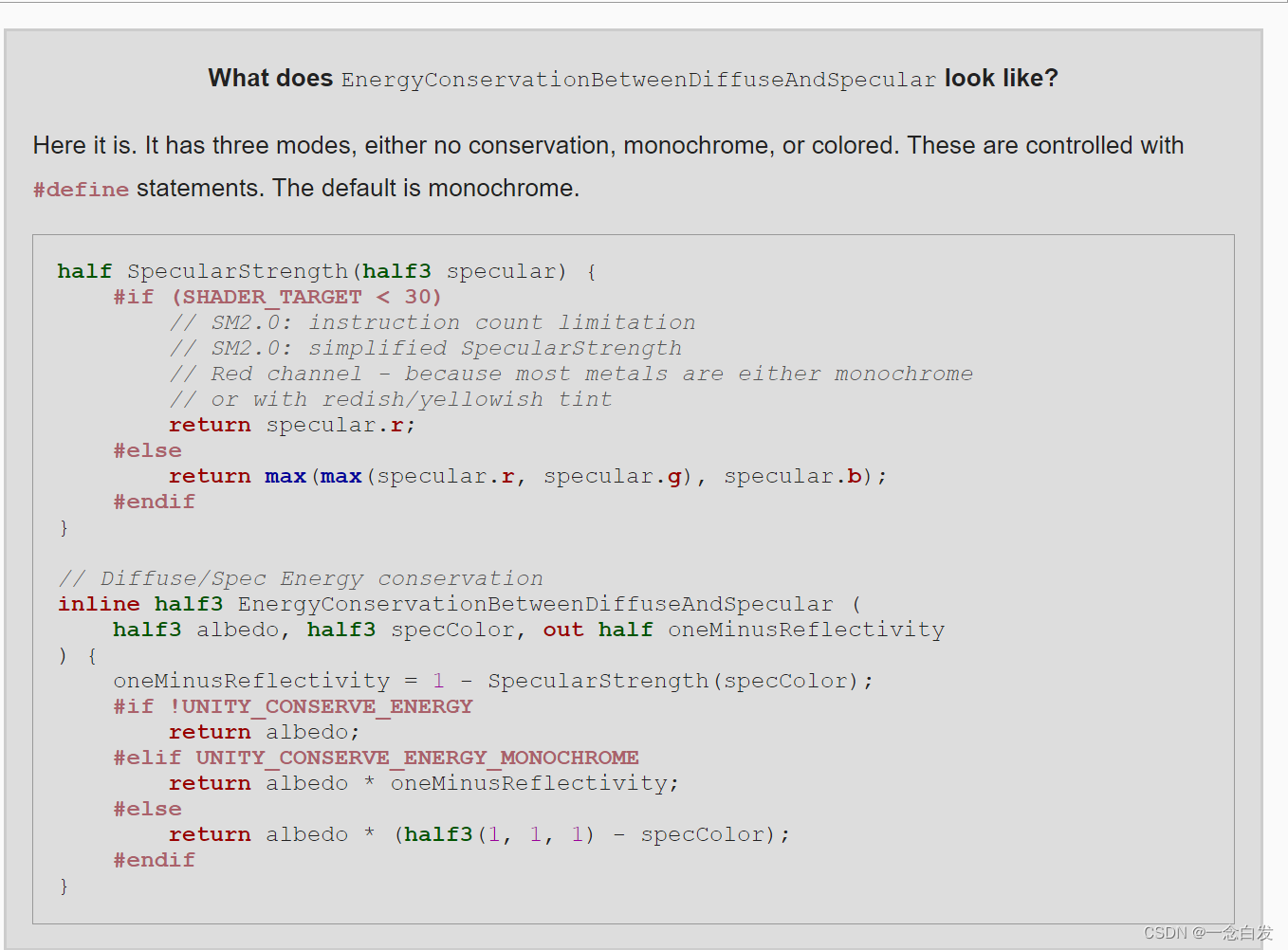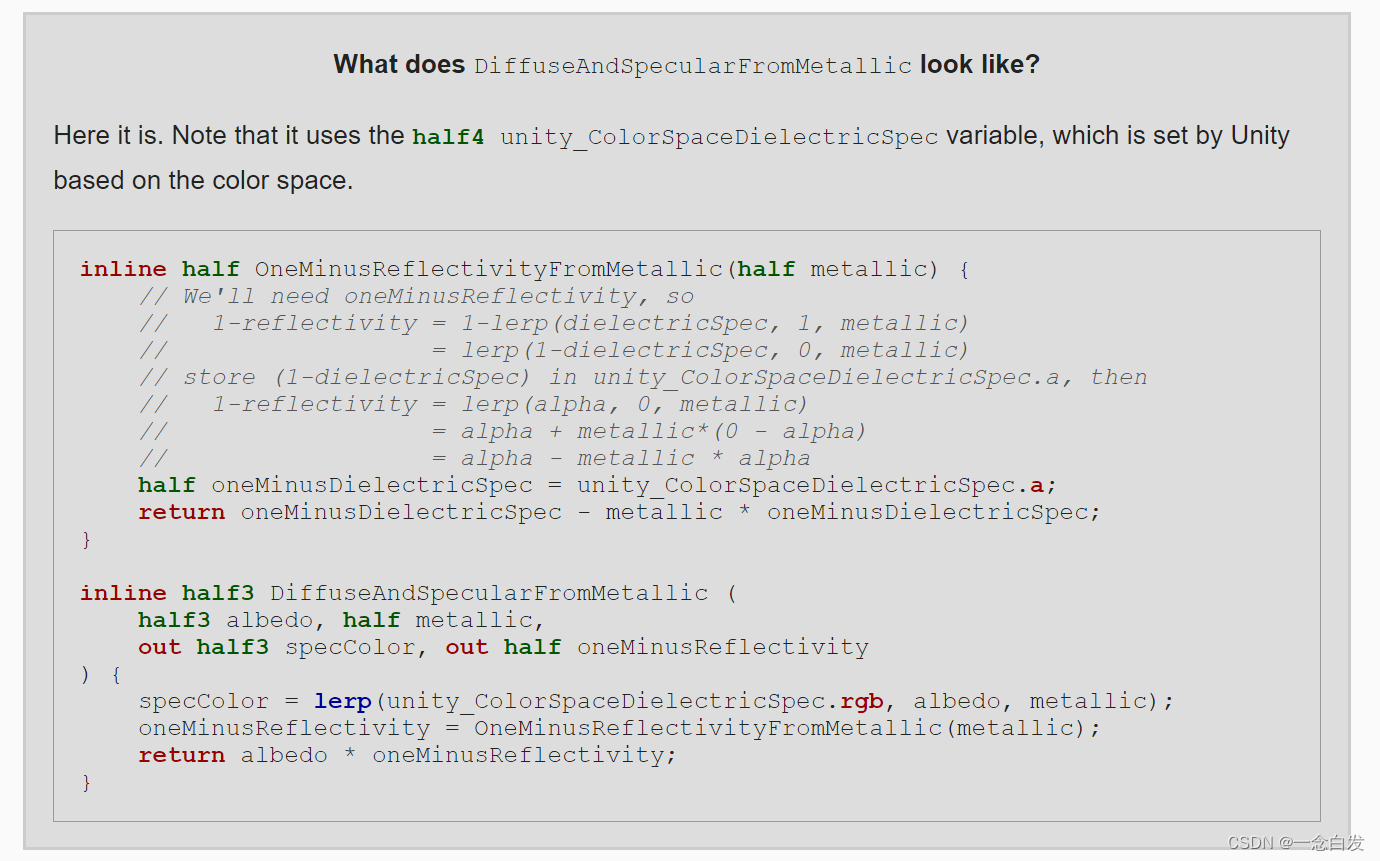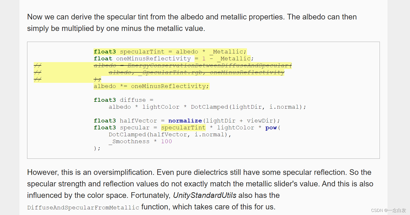 说实话,这个albedo算的是真混乱,高光很清晰,但是albedo真的很乱,从reflectivity就乱,而且当金属度变化的时候,金属度为0,他的反射率本该是接近0的值,现在变得乱七八糟,反正知道乱就得了,下面也说了他是vague的。注意上边写了一个over简化的版本,他写的也是1-reflective是1-metallic,其实如果这里把漫反射高光看作是1的话,也是这个结果,如果能想明白用1-metallic来做这个的合理性,基本上就通了。