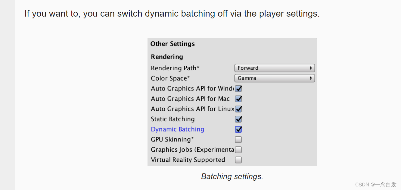 这里注意,他说的dynamic batching的设置,是在player setting里面。也就是file-build setting-player setting。