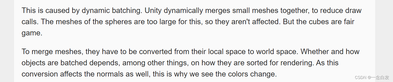首先这里,关于那个立方体object法线输出后居然随着视角变化的现象,他说了原因是为了减少drawcall时使用的dynamic batching导致的。但是我实行了以下,我这里根本不会变化。
