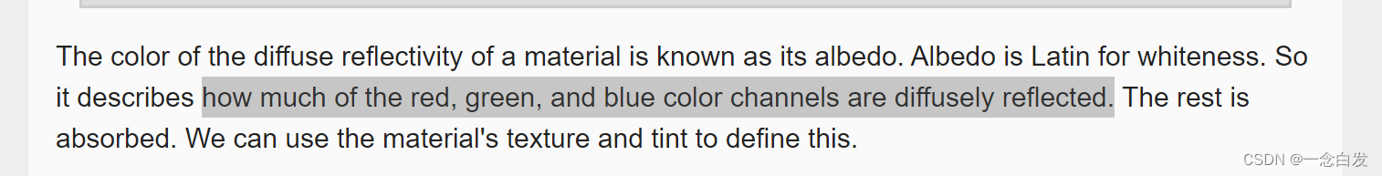 所以那这个反射出去的百分比作为albedo,因为贴图就是代表我们物体本身的颜色,本身的颜色其实就是反射对应的光,所以什么颜色反射什么光,所以颜色可以看作反射率。