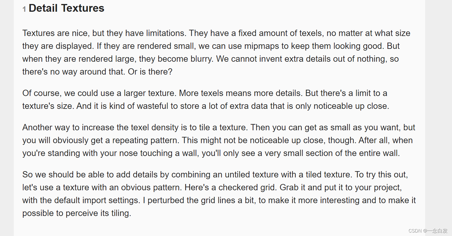 这一节,其实主要两个东西,一个是detail texture,这个主要是用贴图来给另外一个贴图增加细节。并且远距离的时候再fade,结合了mipmap的使用。