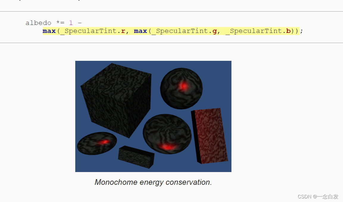 所以说为了保证一个能量守恒,我们怎么做呢?就把一份白色光分成两份,一份是高光的Tint,这个我们拿到这个光去乘以一个小于1的系数。然后albedo去乘以1-高光tint,这样albedo本身是小于1的。