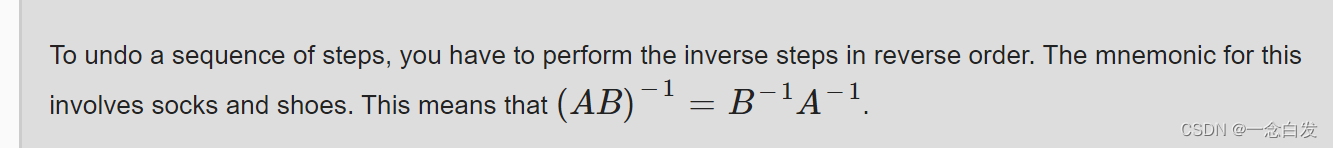 这里的意思是,你做了A,然后做了B,这件事情想要undo应该如何。那就是先做B逆,再做A逆。也就是以相反的顺序去做对应的逆步骤。就像鞋子和袜子。