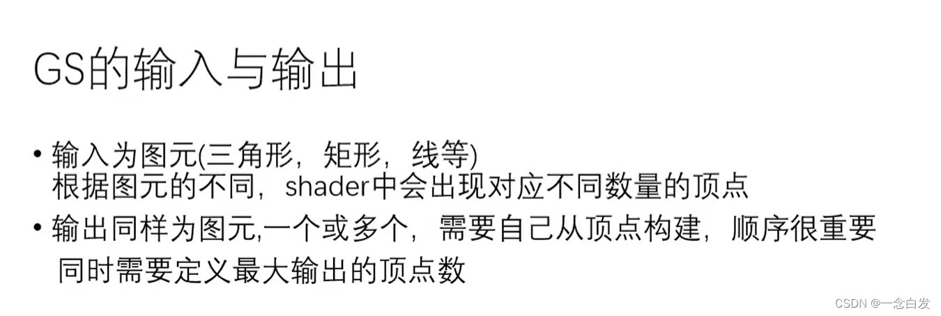 几何着色器就是输入图元,然后自己基于输入的图元顶点,构建出新的顶点或者沿用原图元的顶点,最后组合出一个新的图元输出。