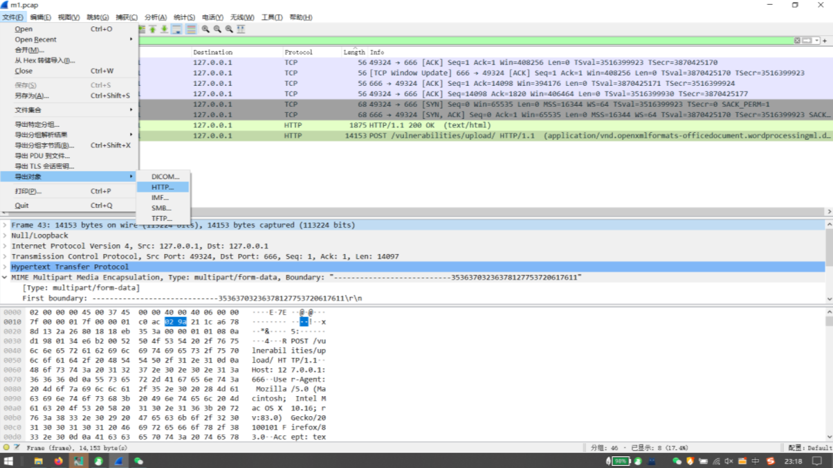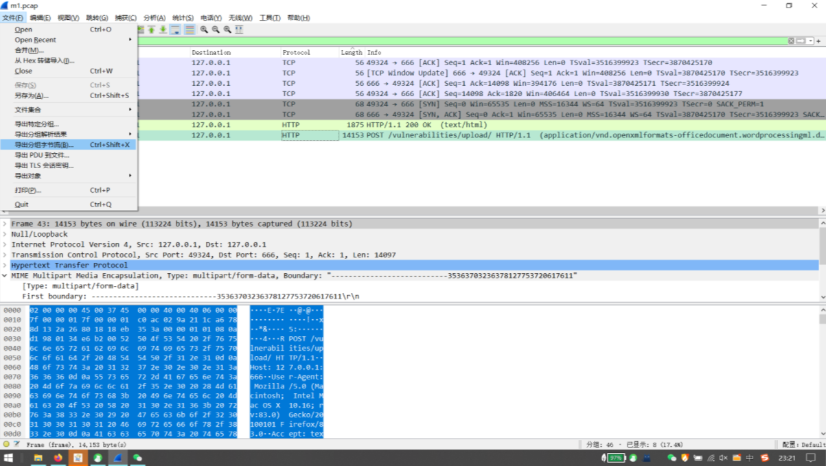 从一个网站抓取的数据包,攻击者上传了一个文件,请从 pacp 将文件还原。