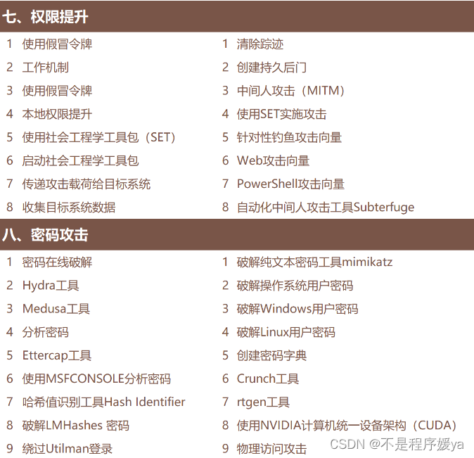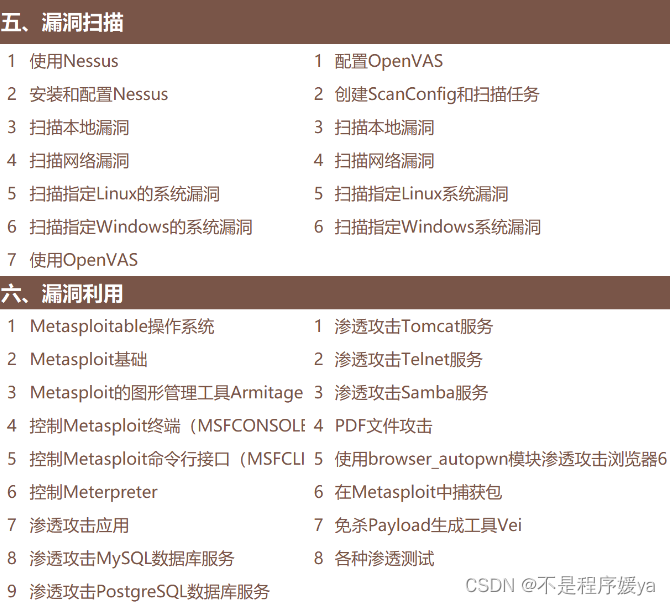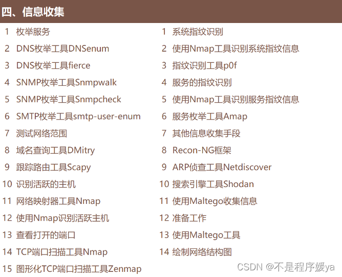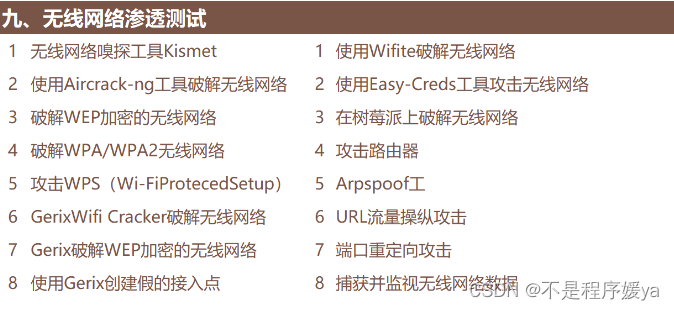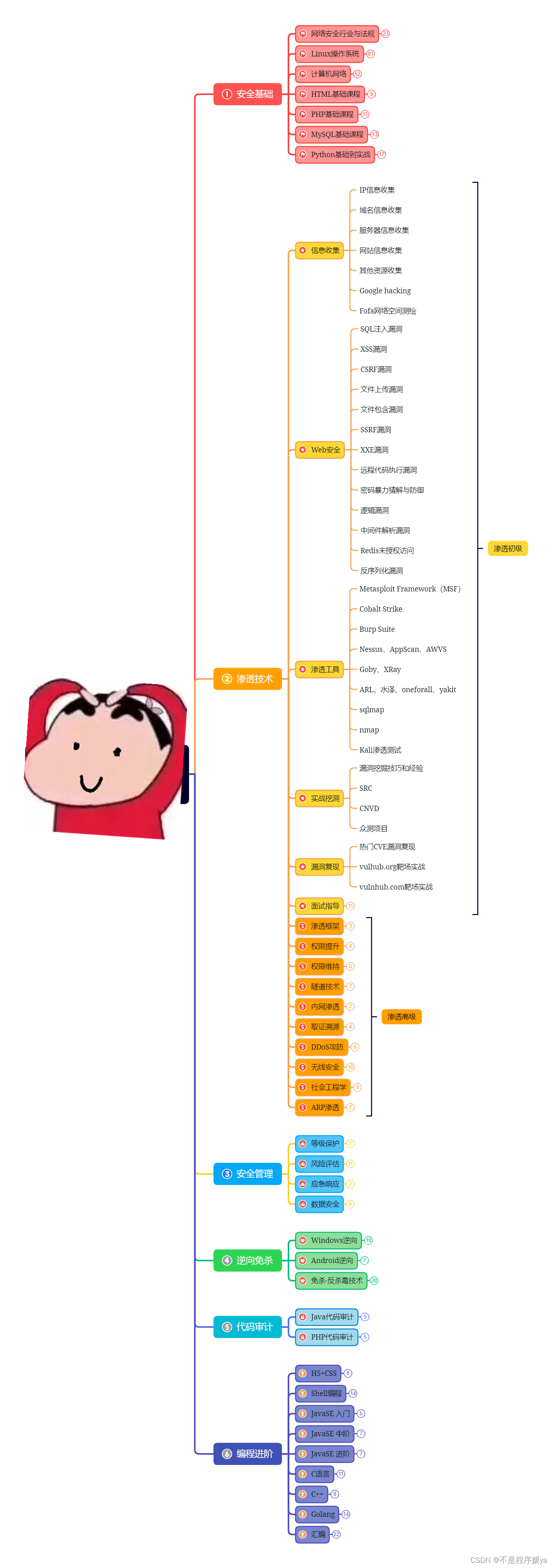 这个方向更符合于大部分人对“黑客”的认知,他们能够黑手机、黑电脑、黑网站、黑服务器、黑内网,万物皆可黑(当然是要有授权的,不然进橘子我可不管),这个方向初期比较容易入门一些,掌握一些基本技术,拿起各种现成的工具就可以开黑了。不过,要想从脚本小子变成黑客大神,这个方向越往后,需要学习和掌握的东西就会越来越多以下是网络渗透需要学习的内容: