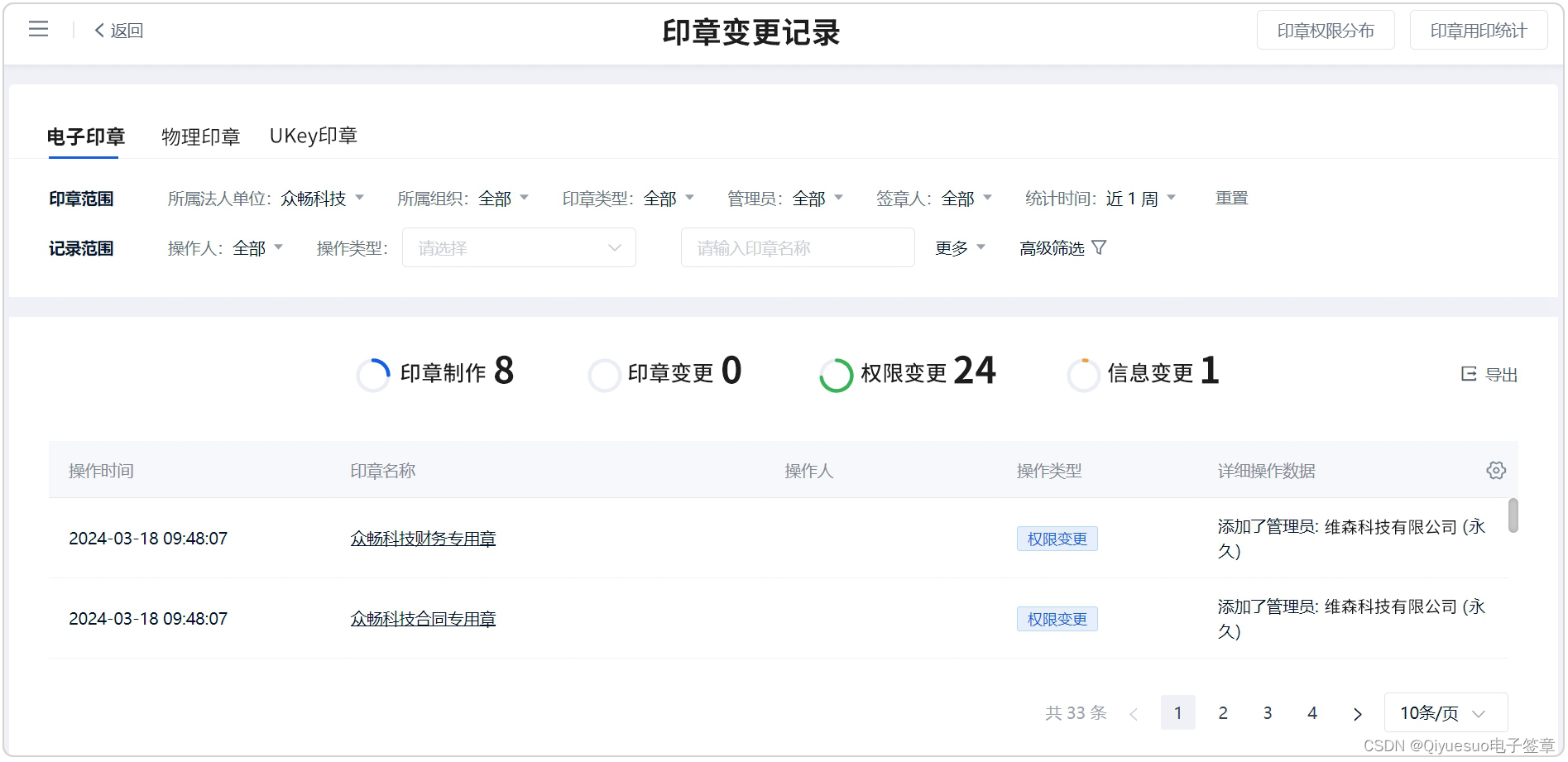 通过印章数据看板可以随时查看各个分子公司的印章变更情况,只需输入具体的印章及操作类型,系统自动完成相关数据统计。